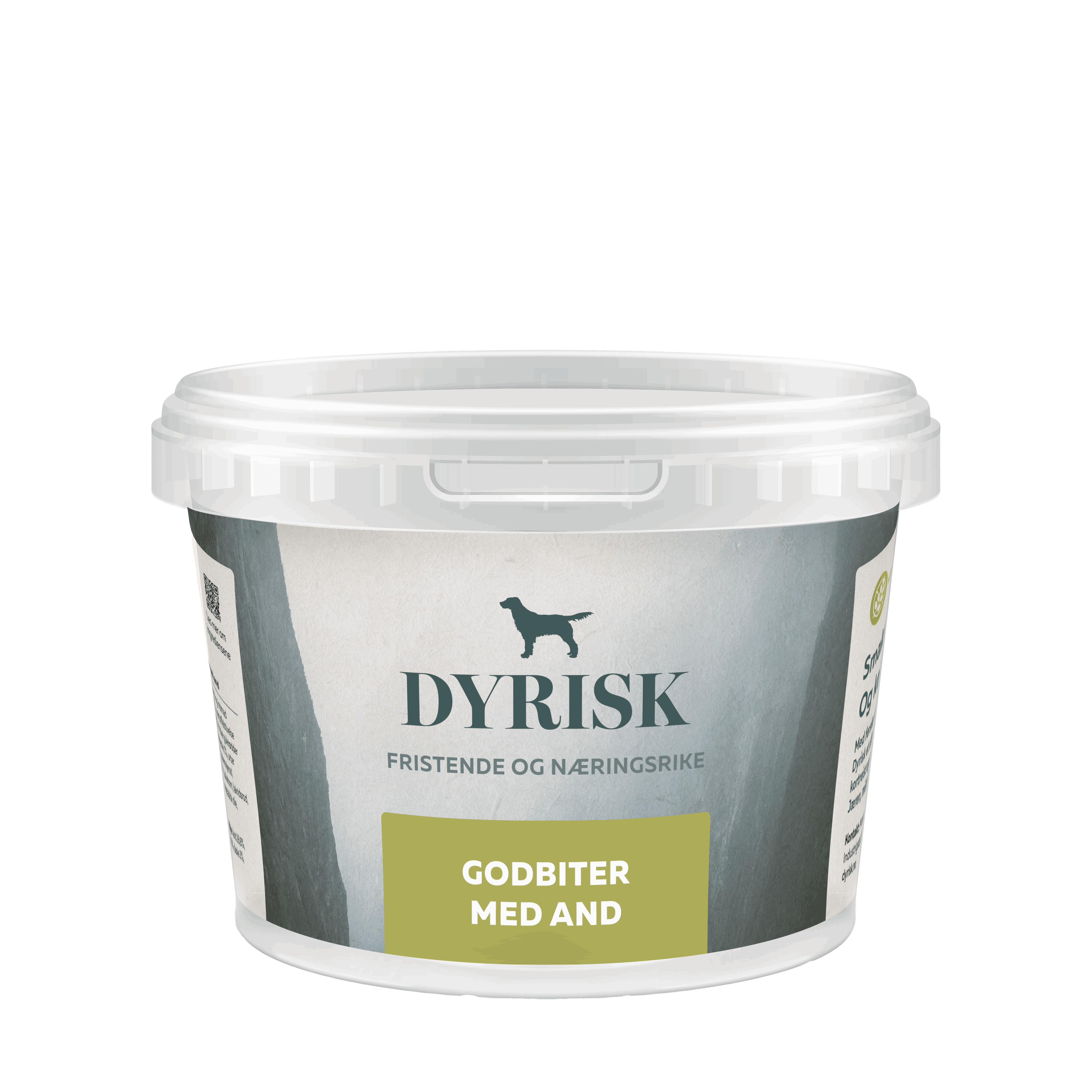 Innhold: Ferskt kjøtt og innmat fra and 52%, potetmel 21%, potetstivelse 15%, fersk potet 4%, fersk gulrot 2%, ferskt eple 2%, lakseolje 1%, urter (peppermynteblad, gurkemeierot, fenikkelfrø, karve, bukkehornkløver, lakrisrot, kamilleblomst) 1%, vegetabilsk olje, mineraler, salt.