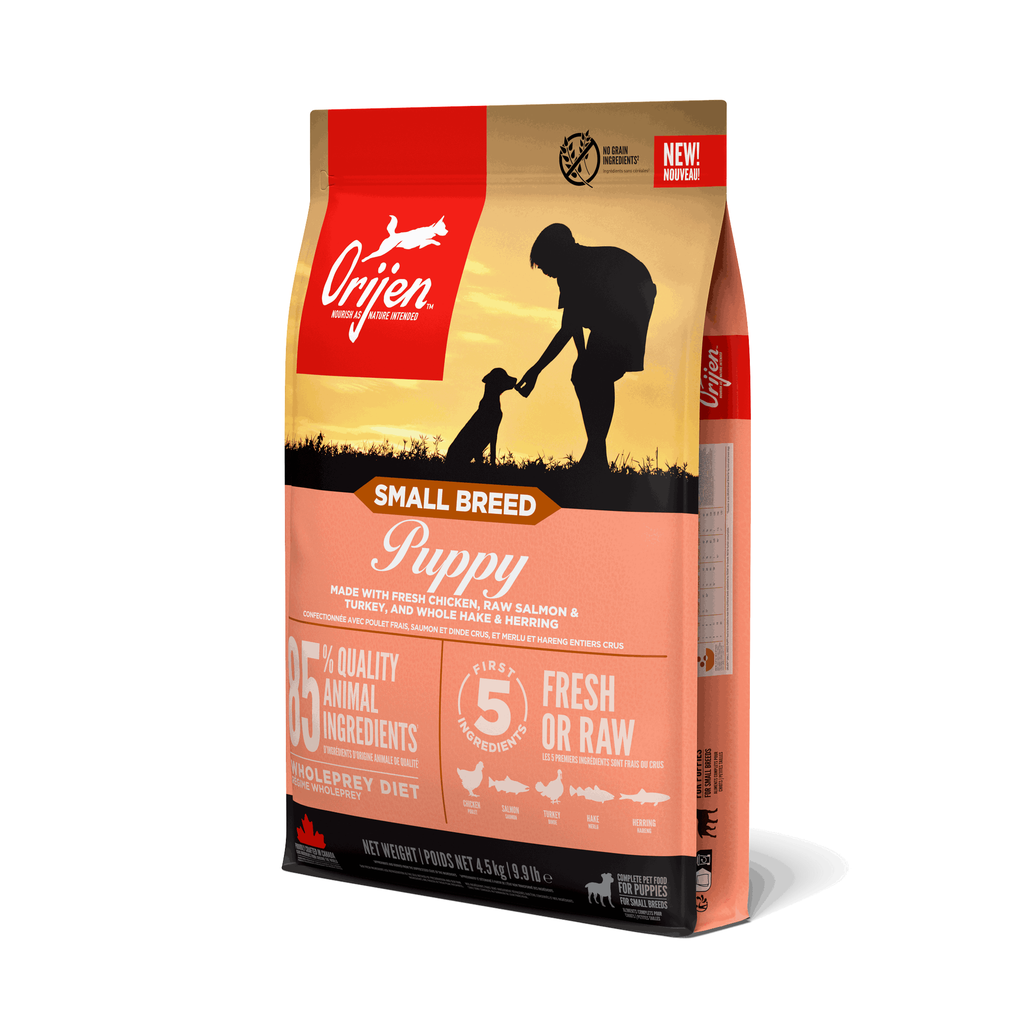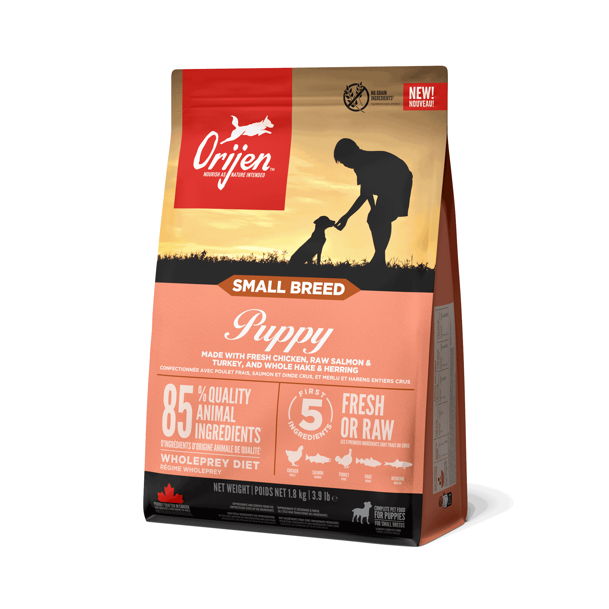 Fersk kylling (18%), rå laks (12%), rå kalkun (10%), rå hel kolmule (4%), rå hel sild (4%),